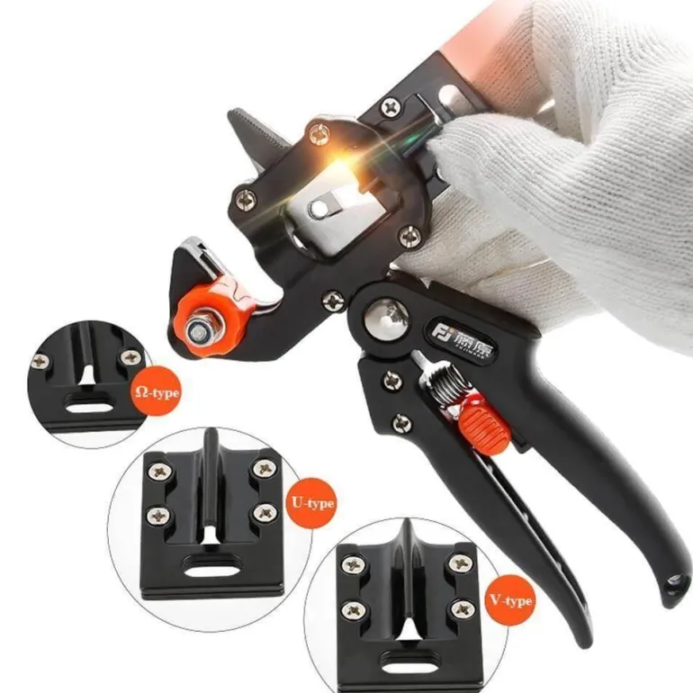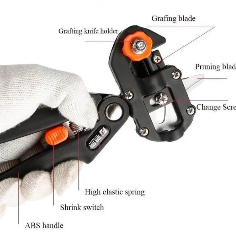Dieses benutzerfreundliche Werkzeug lässt sich von jedem Gartenliebhaber in wenigen Minuten erlernen, sodass keine professionelle Hilfe erforderlich ist. Mit dieser multifunktionalen Schere können Sie effektiv schneiden, verbinden, binden und Pfropfarbeiten erledigen. Dadurch sparen Sie Zeit und Mühe und müssen nicht mehr mit einem Messer die passenden Abhänge an beiden Ästen auskratzen.