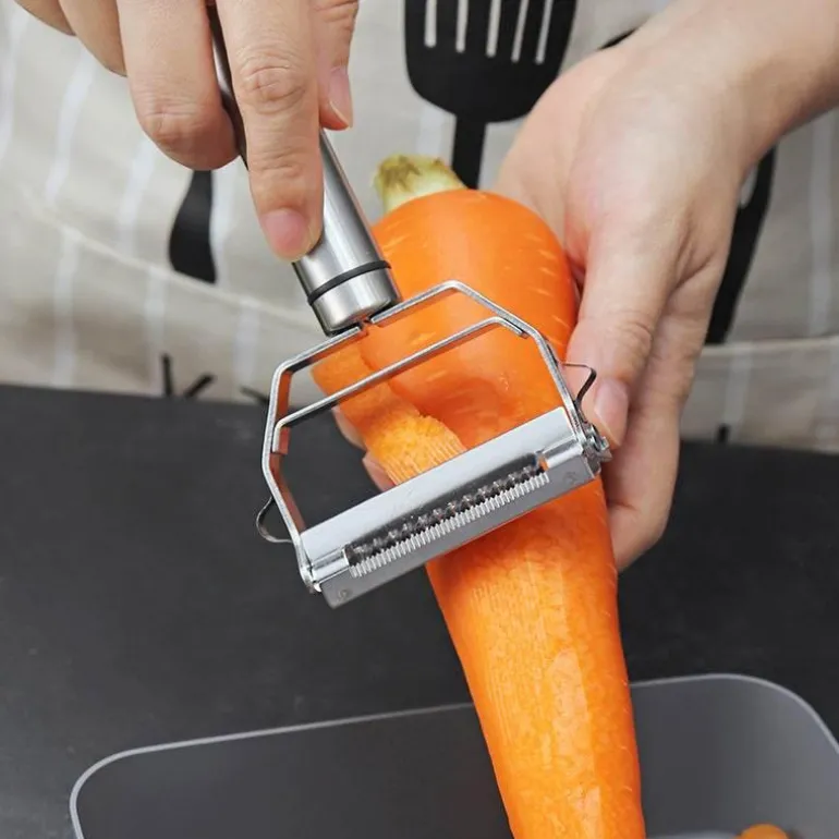 – Mit doppelseitigen Klingen sind sowohl die Vorwärts- als auch die Rückwärtsbewegungen sanft, sodass Sie Ihre Schälarbeiten schneller und effizienter erledigen können.