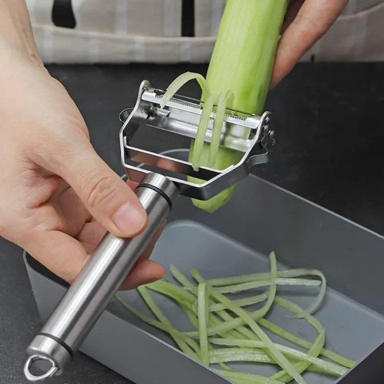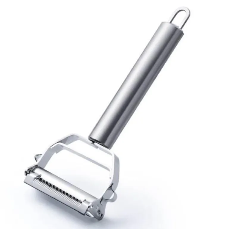 Dieser Gemüseschäler aus Edelstahl ist ein unverzichtbares Werkzeug für jede Küche und sorgt für eine effiziente und angenehme Zubereitung. Der Schäler verfügt über zwei robuste Schabklingen und einen praktischen Kartoffelaugenentferner und ist somit vielseitig einsetzbar.