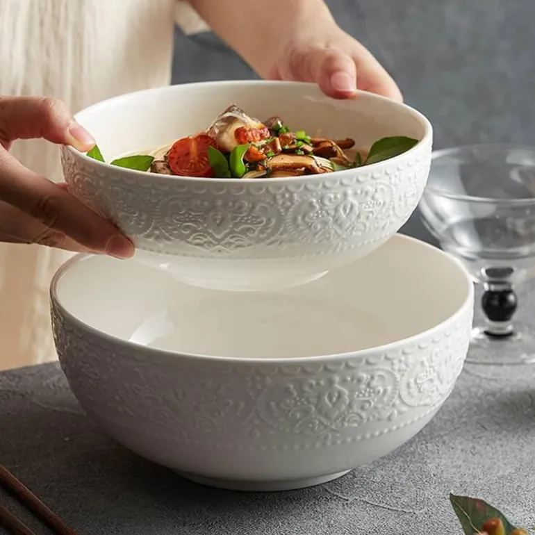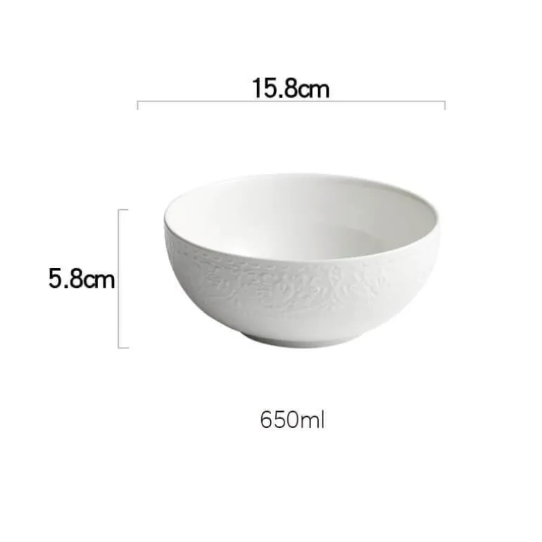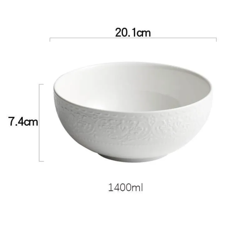 Veredeln Sie Ihr kulinarisches Erlebnis mit der geprägten Keramikschale, einer wunderschön gestalteten Ergänzung Ihrer Geschirrsammlung. Diese Schale besticht durch ihr markantes Prägemuster, das harmonisch mit der glatten, glänzenden Glasur harmoniert und sie perfekt zum Servieren vielfältiger Gerichte macht. Der klassische, reine Weißton harmoniert nicht nur mit jedem Tischgedeck, sondern verleiht ihm auch eine edle Note. Die strukturierte Oberfläche verleiht Ihren Mahlzeiten zudem eine angenehme Haptik.