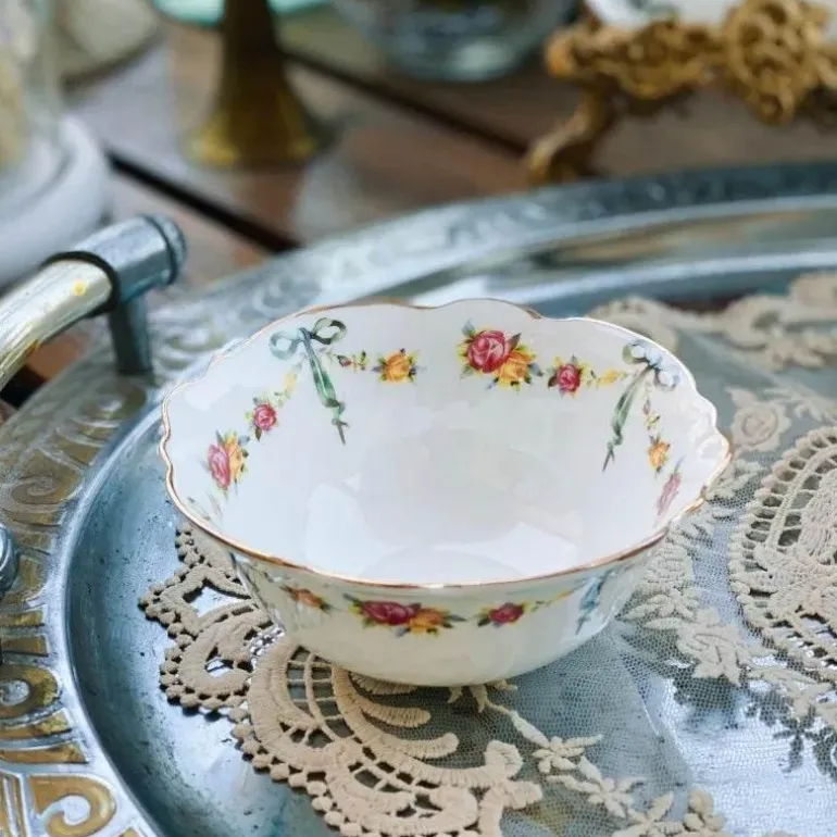 Veredeln Sie Ihr kulinarisches Erlebnis mit dem exquisiten Ribbon Rose Bone China Geschirrset, bestehend aus Kaffeetasse, Untertasse und Reisschüssel. Gefertigt aus hochwertigem Bone China, vereint diese Kollektion mühelos Robustheit mit zarter Eleganz und eignet sich perfekt für alltägliche Mahlzeiten und besondere Anlässe.