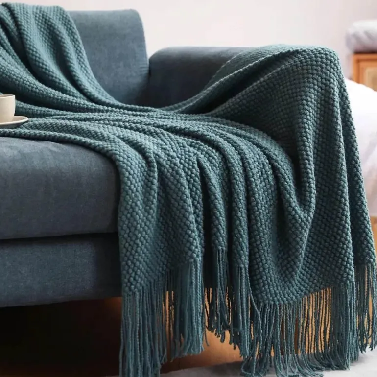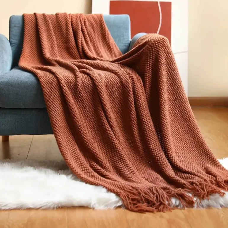 Erleben Sie die Wärme und Gemütlichkeit dieser hochwertigen Garndecke, die sich perfekt für das ganze Jahr eignet. Dank ihres geringen Gewichts und ihrer Tragbarkeit ist sie der ideale Begleiter für gemütliche Abende auf der Couch an kühlen Frühlingstagen oder zum Entspannen in der frischen Herbstluft.