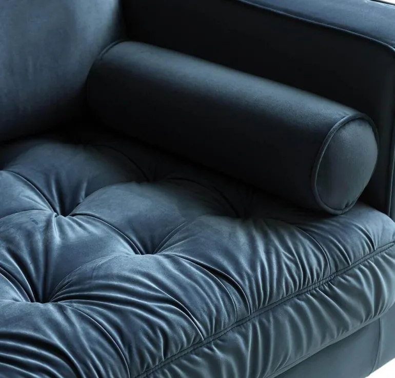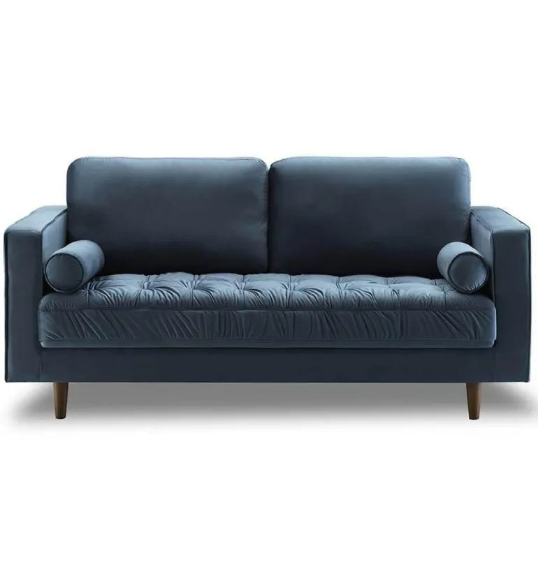 Wir präsentieren das Bente Tufted Velvet Loveseat, ein stilvolles 2-Sitzer-Sofa, das moderne und Mid-Century-Designeinflüsse nahtlos miteinander verbindet. Dieses elegante Möbelstück zeichnet sich durch klare Linien und eine weiche, gepolsterte Sitzbank aus, die sowohl Komfort als auch optische Reize bietet. Mit zwei großzügig gefüllten Rückenkissen und zwei passenden runden Nackenrollen bietet das Sofa optimalen Halt und eine raffinierte Ästhetik.
