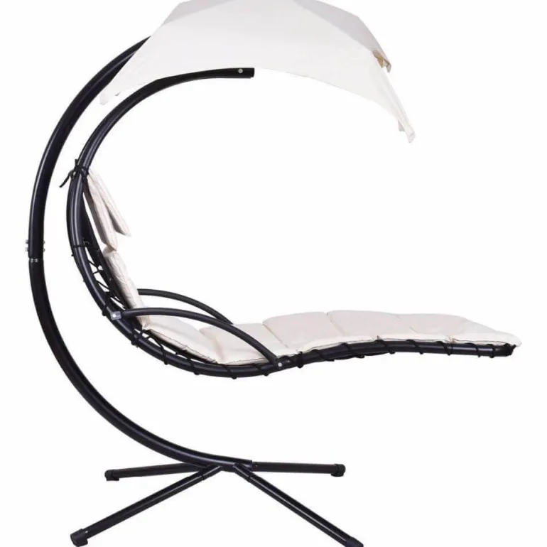 Zu den wichtigsten Merkmalen gehören ein durchdachtes, integriertes Sonnendach sowie praktische Armlehnen für mehr Komfort. Das abnehmbare, 5 cm dicke Polsterkissen mit integrierter Kopfstütze sorgt für unvergleichliche Entspannung. Der Hängesessel schwingt frei auf dem robusten, schwarz pulverbeschichteten Stahlrohrrahmen und ist bis zu 120 kg belastbar. Das Kissen liegt auf einem strapazierfähigen schwarzen Stoff, der mit starken Kordeln sicher am Rahmen befestigt ist.