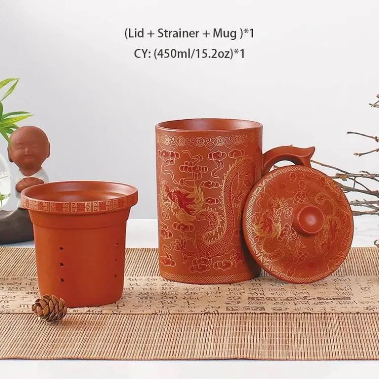 Erleben Sie die Kunst des Teetrinkens mit unserer handgefertigten Yixing-Teetasse mit integriertem Deckelsieb für komfortables Aufbrühen. Diese einzigartige Teetasse wurde sorgfältig aus hochwertigem Zisha-Ton gefertigt und fasst großzügige 450 ml. Damit ist sie der ideale Begleiter für Ihre täglichen Teerituale.