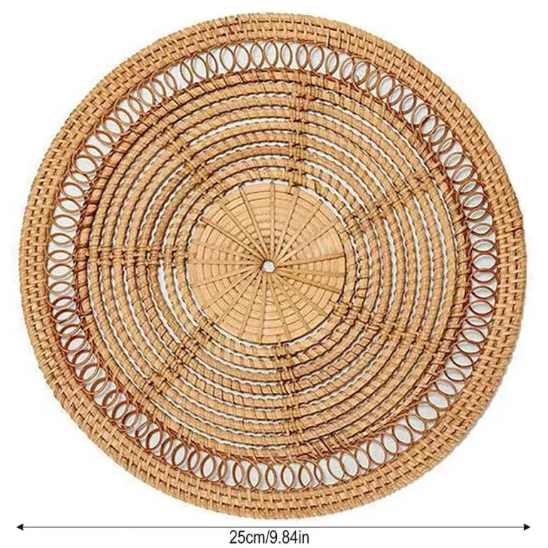 Dieses Set besteht aus drei einzigartigen Stücken mit Durchmessern von 25 cm, 30 cm und 33 cm. Jedes Stück zeugt von handwerklicher Handwerkskunst und unterstreicht die komplexen Flechttechniken und die erdigen Töne des Rattans. Diese Dekostücke verschönern nicht nur Ihre Wände, sondern erfüllen auch praktische Zwecke, beispielsweise als Tischsets oder Untersetzer für besondere Anlässe.