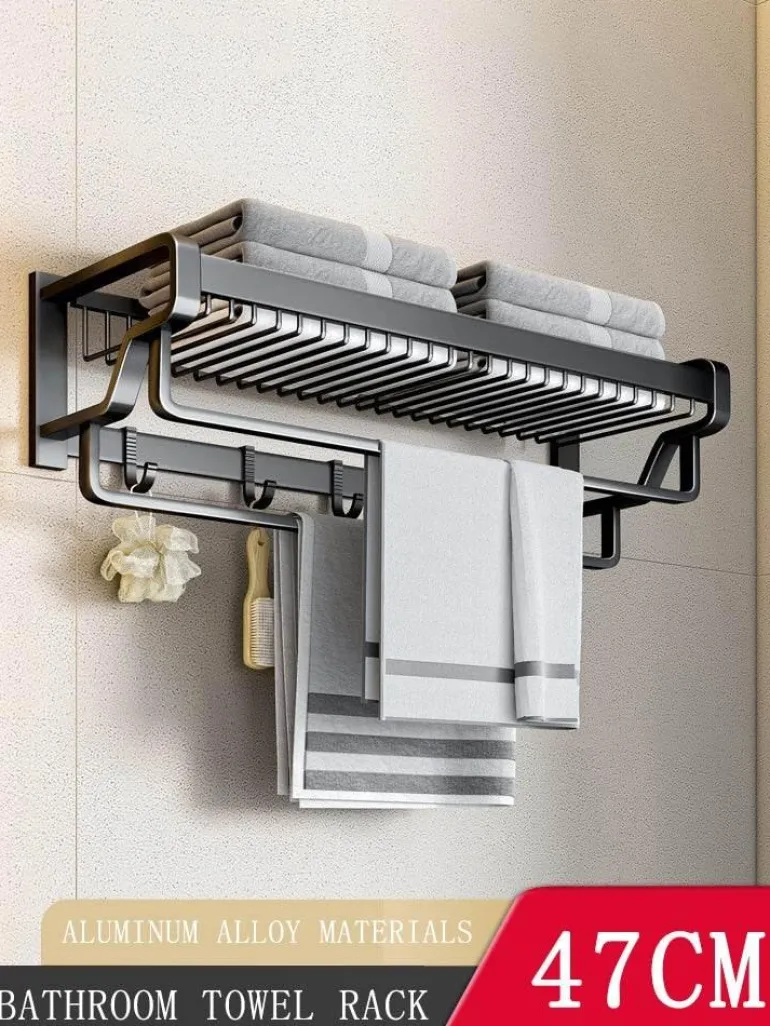Verwandeln Sie Ihr Badezimmer mit dem Luxe Handtuch-Organizer zur Wandmontage – eine elegante und funktionale Ergänzung. Hergestellt aus einer robusten Aluminiumlegierung, ist dieser elegante Organizer für den täglichen Gebrauch konzipiert und wertet Ihr Badezimmerdekor auf. Er verfügt über mehrere Stangen zum sicheren Aufhängen von Handtüchern und ermöglicht so schnellen und einfachen Zugriff, wann immer Sie sie brauchen. Das integrierte Regal bietet großzügigen Stauraum für Toilettenartikel und andere Badutensilien und sorgt für ein sauberes und ordentliches Badezimmer.