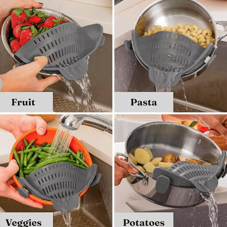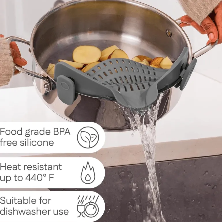 Universelle Passform: Dank des innovativen Clip-On-Designs passt dieses Sieb auf eine Vielzahl von Töpfen, Pfannen und Schüsseln. Es ist außerdem spülmaschinenfest und lässt sich mühelos reinigen. Hergestellt aus lebensmittelechtem Silikon, ist es hitzebeständig und hält Temperaturen von -32 °C bis 184 °C stand. Das antihaftbeschichtete, ungiftige Material ist geruchsneutral und sorgt für ein sicheres Kocherlebnis.