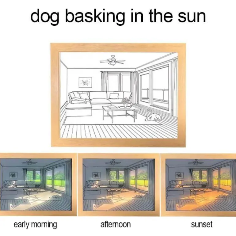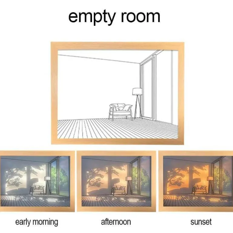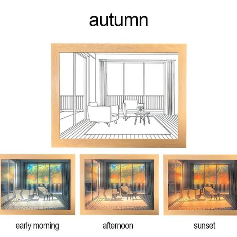 Tauchen Sie ein in eine Vielzahl beruhigender Lichtszenen, darunter „Leerer Raum“, „Hund sonnt sich“, „Meeresküste“ und „Herbst“, die alle darauf ausgelegt sind, eine heitere Atmosphäre in Ihrem Zuhause zu schaffen.