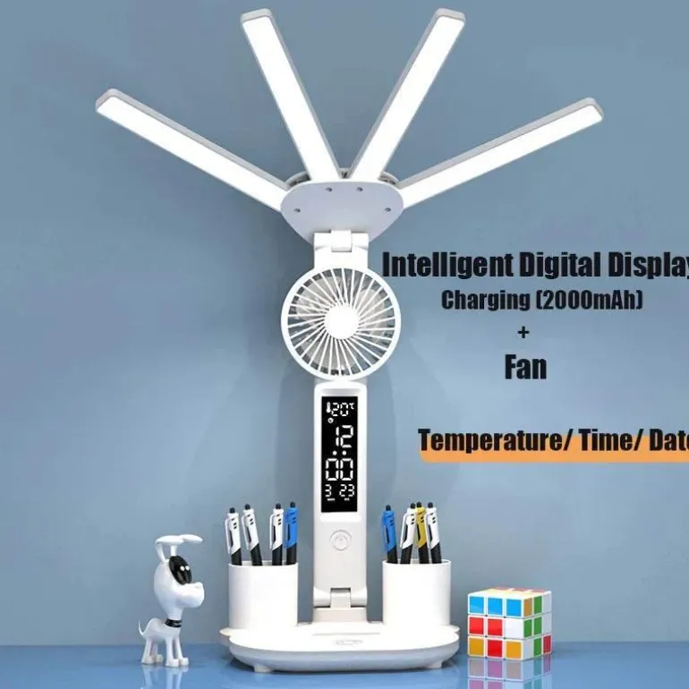 Nutzen Sie diese Multifunktionsleuchte zum Lernen, als Leselicht am Bett oder um Ihren Schreibtisch mit dem eingebauten Ventilator kühl zu halten. Die integrierte Uhr hilft Ihnen, Ihre Zeit effizient zu verwalten.