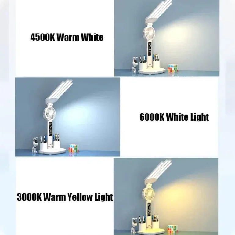 Im Gegensatz zu vielen herkömmlichen Schreibtischlampen zeichnet sich dieses 3-in-1-Modell dadurch aus, dass es Beleuchtungs-, Kühlungs- und Zeitanzeigefunktionen in einer kompakten und eleganten Einheit vereint.