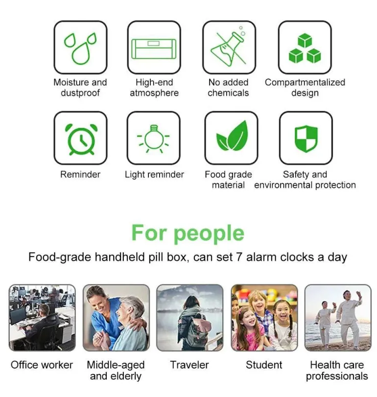 – Besondere Merkmale: Alarm bei vergessener Medikamenteneinnahme, zeitgesteuerte Erinnerungen, tragbares Design