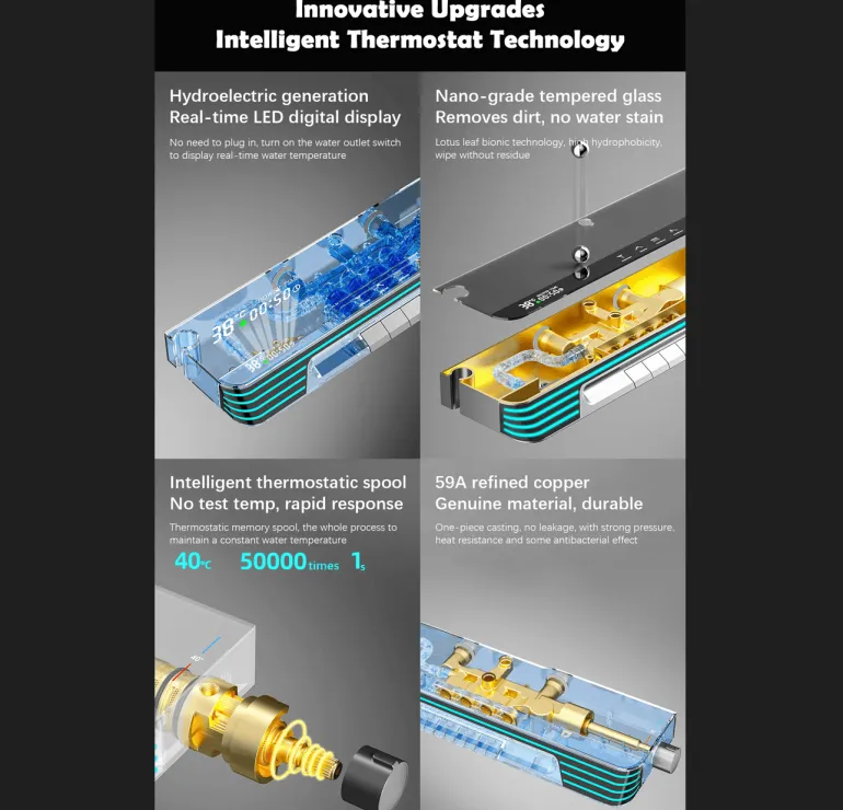 Zu den wichtigsten Funktionen gehören eine benutzerfreundliche Digitalanzeige, mehrere Massageoptionen (Regen, sanfter Nebel, Puls), eine robuste Messingkonstruktion mit elegantem Chrom-Finish und ein Wandmontagedesign, das den Platz maximiert und gleichzeitig Unordnung minimiert.