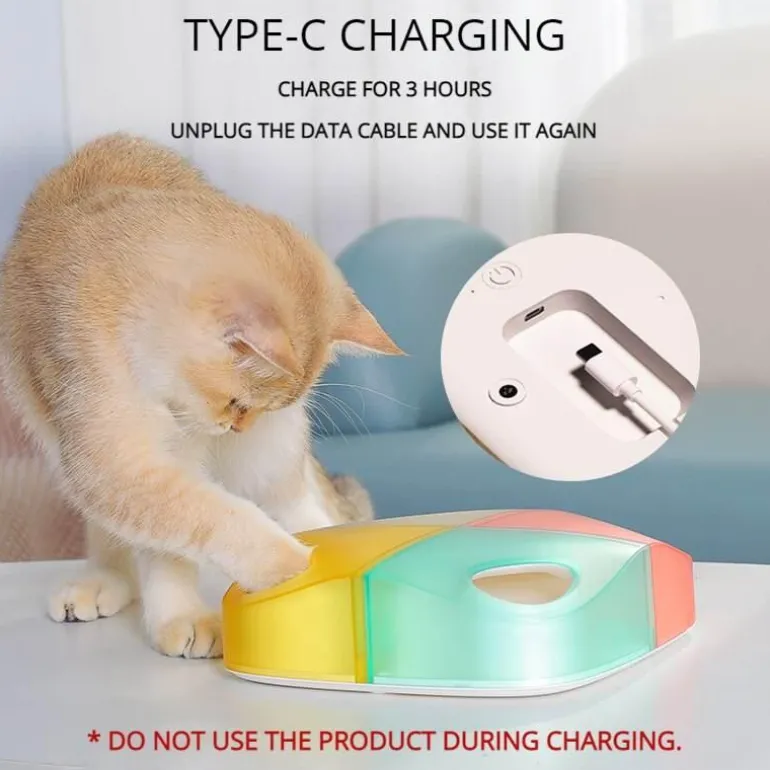 Diese Spielzeugbox aus robustem ABS-Material wiegt 750 g und misst 21 cm x 21 cm x 7,5 cm. Damit ist sie eine kompakte und zugleich attraktive Ergänzung für die Katzensammlung. Der Typ-C-Ladeanschluss ermöglicht ein bequemes und effizientes Aufladen des eingebauten Akkus mit einer Kapazität von 3,7 V und 2000 mAh.