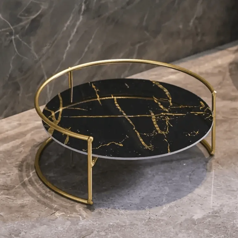 Elevate your beauty routine with the Ivalo Cosmetics Tray, a sophisticated makeup organizer designed for both functionality and style. Featuring a sleek, rounded base secured by elegant gold-finished metal frames, this tray ensures your cosmetics and essentials are beautifully displayed and easily accessible. The handcrafted marble-effect surfaces add a touch of refinement, making it a stunning addition to any vanity or countertop.
