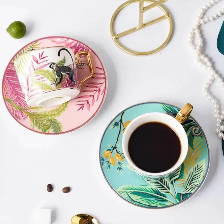 Erleben Sie die raffinierte Eleganz des Jungle Secret Teetassen-Sets, das Ihre Teegenussmomente perfektioniert. Diese Kollektion vereint harmonisch Ästhetik mit praktischer Funktionalität und ist damit eine außergewöhnliche Wahl für Teeliebhaber.