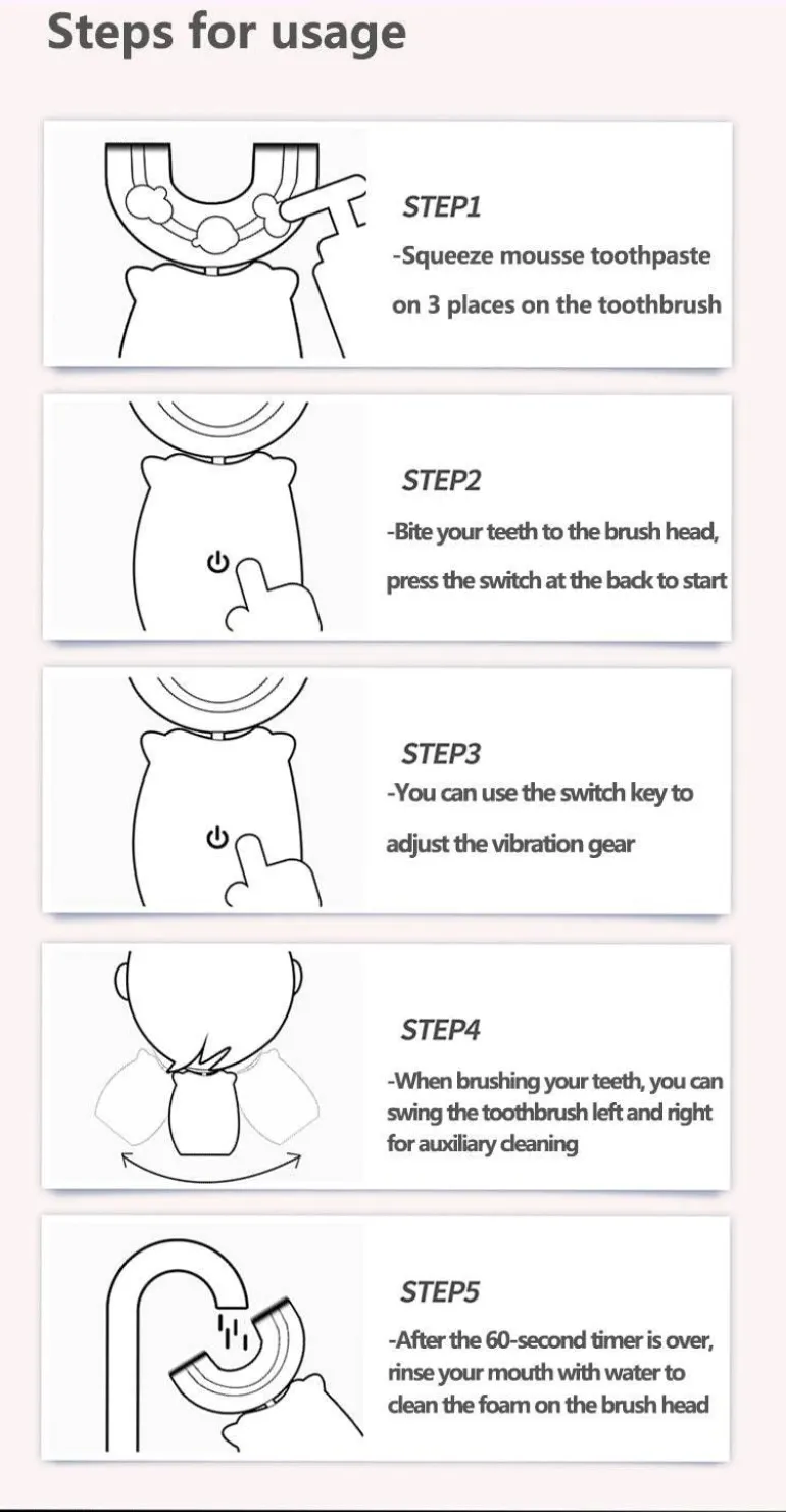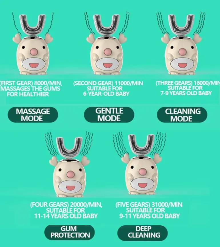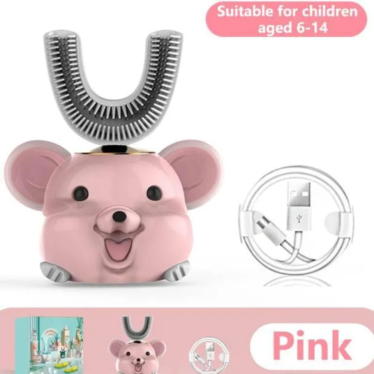 Introduce your child to a fun and engaging dental care routine with our ultrasonic silicone toothbrush, designed especially for kids. This innovative electric toothbrush turns tooth brushing from a mundane task into an enjoyable experience. It features a unique U-shaped brush tip made from soft silicone, effectively cleaning teeth, gums, and the tongue.
