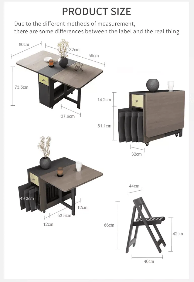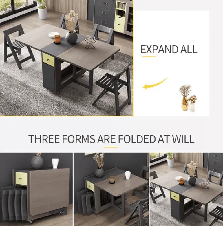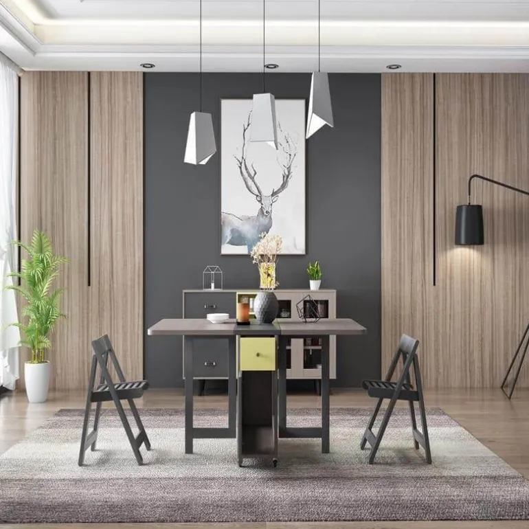 Dieses moderne Esstisch-Set aus Holz besticht durch sein schlichtes, minimalistisches Design, das den Platz optimal nutzt und sich perfekt für Wohnungen eignet, in denen jeder Quadratmeter zählt. Das klappbare Design ermöglicht eine mühelose Umgestaltung und schafft wertvollen Platz, wenn der Tisch nicht gebraucht wird.