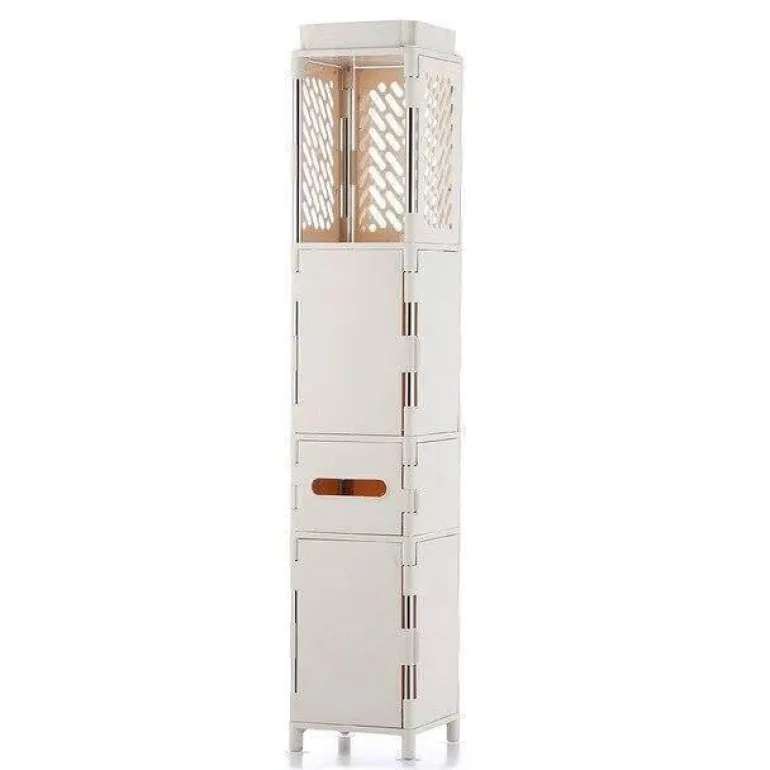 Ausgestattet mit Türen und Regalen bietet dieses Aufbewahrungsmöbel eine praktische Möglichkeit, Handtücher, Shampoo und andere wichtige Utensilien aufzubewahren und so für Ordnung im Badezimmer zu sorgen. Der Schrank aus strapazierfähigem, wasserdichtem PP-Material ist umweltfreundlich und sicher und eignet sich daher perfekt für feuchte Umgebungen.