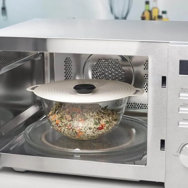 Dieser vielseitige Deckel eignet sich ideal zum Kochen und Braten und dient als Schutzabdeckung für heiße und kalte Umgebungen. In der Mikrowelle verhindert er Spritzer, spart Ihnen Zeit beim Aufräumen und reduziert die Verwendung von Einweg-Plastikfolien.