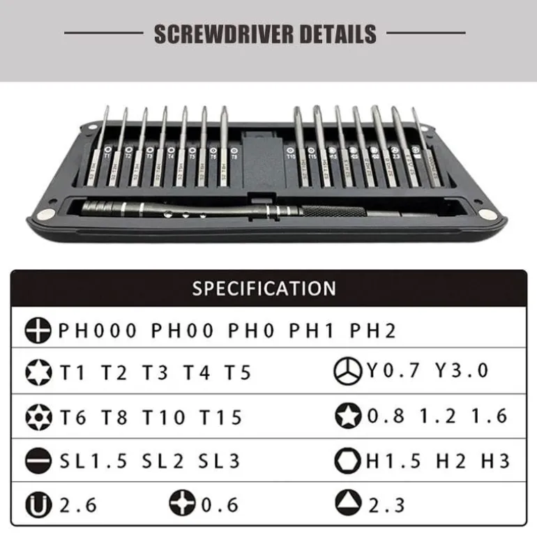 Wir präsentieren ein vielseitiges magnetisches Schraubendreher-Set für Langlebigkeit und Benutzerfreundlichkeit. Der Griff aus rostfreier Aluminiumlegierung sorgt für Langlebigkeit und sicheren Halt. Die mitgelieferte Aufbewahrungsbox hält Ihre Werkzeuge übersichtlich und griffbereit. Jeder Bitkopf ist magnetisch und ermöglicht so müheloses Aufnehmen von Schrauben. Ideal für Arbeiten an Uhren, Kameras, Computern, Mobiltelefonen und anderen Geräten.