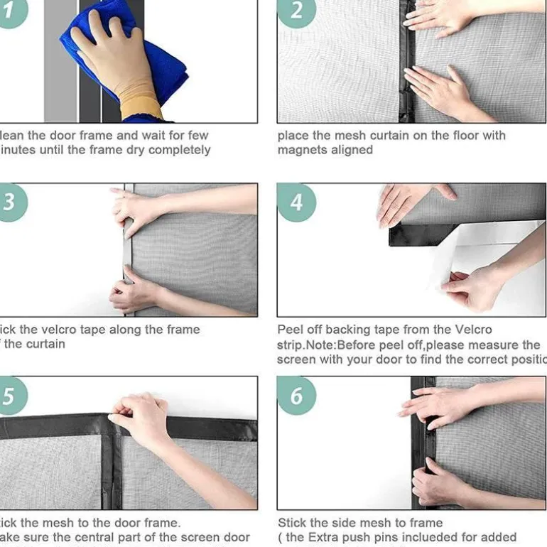 Die Montage ist einfach und erfordert kein Werkzeug. Verstärkte Klebestreifen und hochwertige, rostfreie Nägel sorgen für einen sicheren und dauerhaften Halt. Für optimale Haftung reinigen Sie einfach die Oberfläche Ihres Türrahmens vor der Montage. Der robuste Magnetverschluss sorgt für eine vollständige Abdichtung und schließt mühelos hinter Ihnen, sodass kein manuelles Nachjustieren erforderlich ist.
