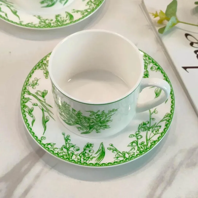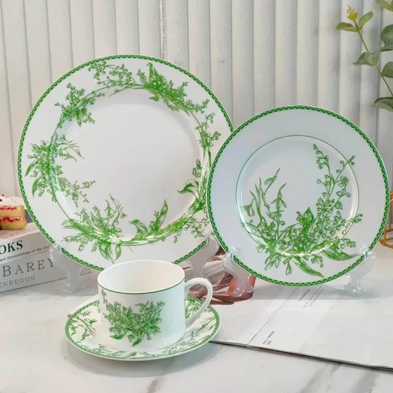 Wir präsentieren das Maiglöckchen-Geschirrset aus Bone China, eine zeitlose Ergänzung Ihrer Essecke, die Ihren Mahlzeiten Eleganz verleiht. Mit größter Präzision und Liebe zum Detail gefertigt, präsentiert dieses Geschirrset bezaubernde Blumenmuster, die jedem Tisch einen Hauch von Eleganz verleihen. Die raffinierten Designs sind ein optischer Genuss und machen jede Mahlzeit zu etwas Besonderem und Einladendem.