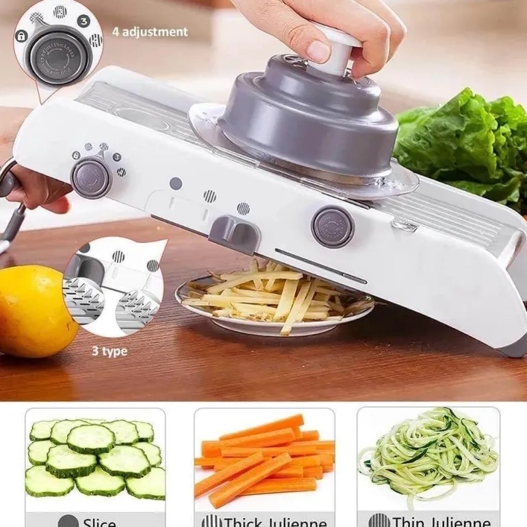 Dieser manuelle Gemüsehobel aus Edelstahl ist ein unverzichtbares Küchenwerkzeug für jeden Kochbegeisterten. Dank seiner vielseitigen Funktionen kann er eine Vielzahl von Gemüse- und Obstsorten schneiden, würfeln, hacken und in Julienne-Streifen schneiden, sodass Sie Ihre Lieblingszutaten mühelos zubereiten können. Von Karotten und Gurken bis hin zu Süßkartoffeln und Radieschen – kreieren Sie formschöne Stücke, die Ihre Gerichte verfeinern.