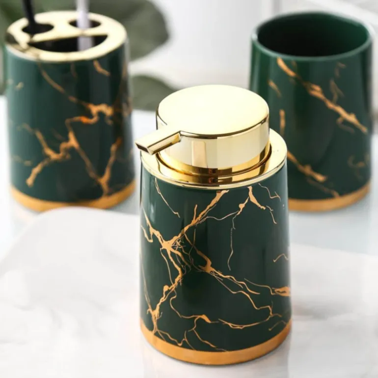 Transform your bathroom with our Ceramic Bathroom Accessory Set, designed to capture the sophisticated charm of marble while ensuring practical functionality. This collection is available in rich shades of green, classic black, and pristine white, with striking gold accents that enhance each piece’s elegance. The ceramic accessories expertly replicate the timeless appeal of marble, creating a serene atmosphere that complements various interior styles.