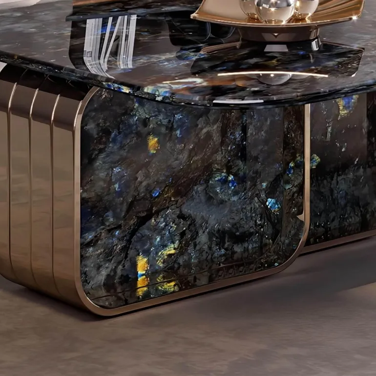 Wir präsentieren den Sandrine Marmor-Couchtisch, eine unverwechselbare Ergänzung für moderne Wohnzimmer, die die Schönheit seltenen blauen, mehrfarbigen Marmors in Szene setzt. Jeder Tisch ist ein Unikat mit komplexen Mustern, die tiefe Blautöne, Goldtöne und dezente Erdtöne harmonisch miteinander verbinden.