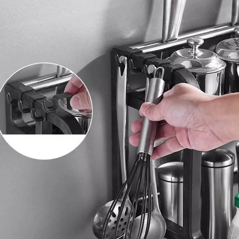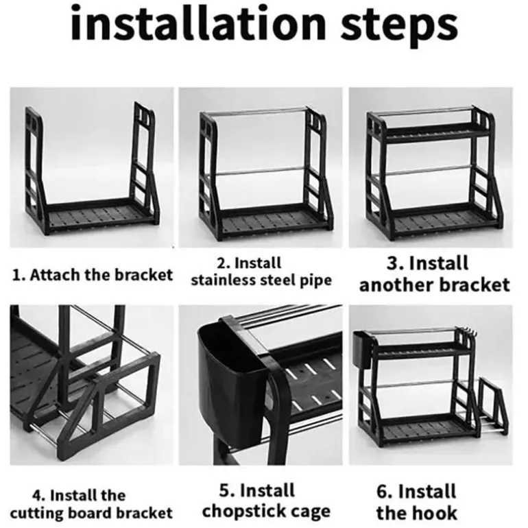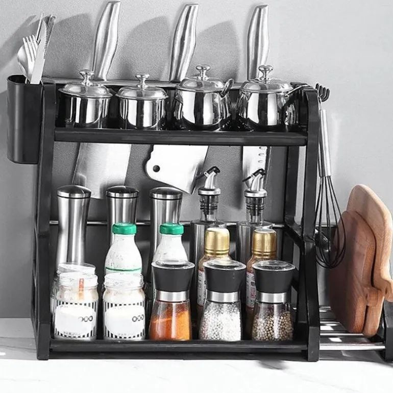 Das mehrstöckige Küchenregal erfüllt die täglichen Bedürfnisse Ihrer Familie und bietet eine praktische Lösung für die Organisation Ihrer Küchenutensilien. Die doppellagige Struktur bietet ausreichend Platz für Geschirr, während der integrierte, hängende Essstäbchenhalter mit seinem cleveren Hohlablaufdesign für optimale Belüftung und schnelles Trocknen der Utensilien sorgt.