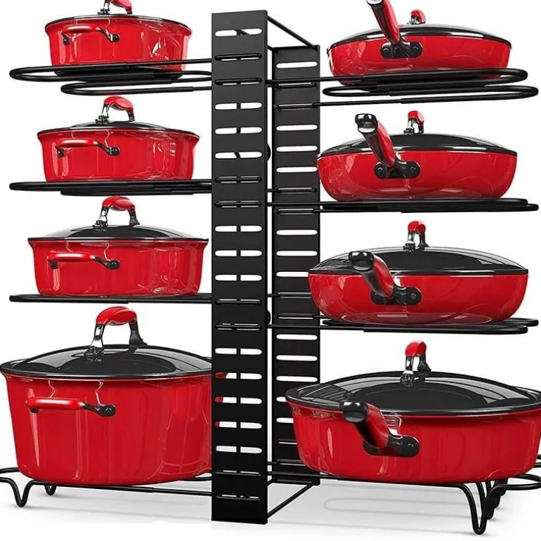 Maximieren Sie Ihren Küchenstauraum mit diesem vielseitigen, mehrstufigen, verstellbaren Pfannenhalter für 8 oder mehr gestapelte Töpfe und Pfannen. Das kompakte Design optimiert den Platz in Küchenschränken, Vorratskammern und auf Arbeitsplatten und sorgt dafür, dass Ihr Kochgeschirr stets griffbereit und übersichtlich ist.