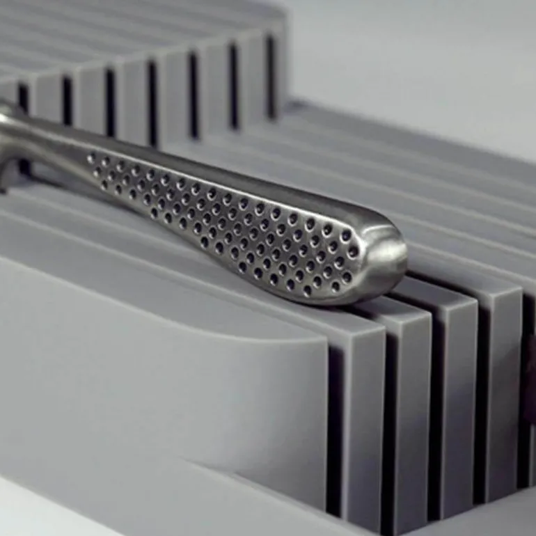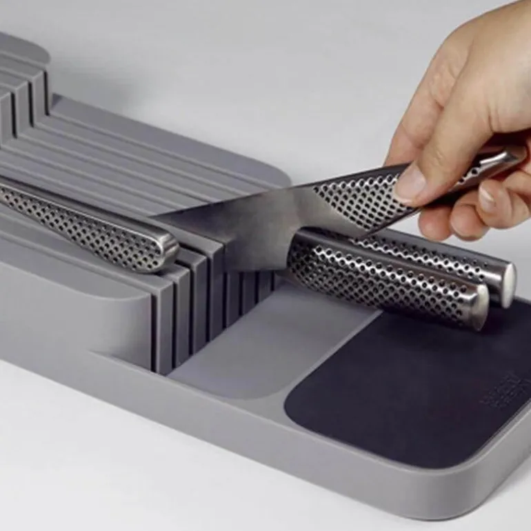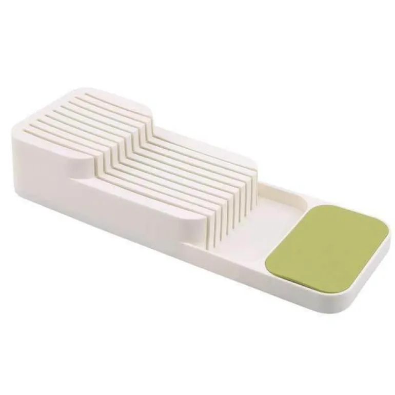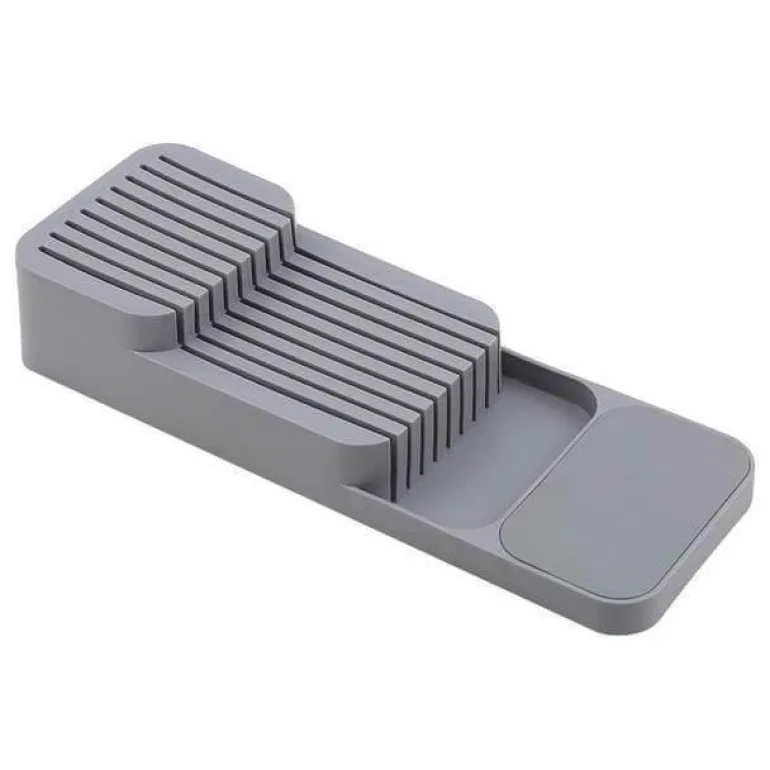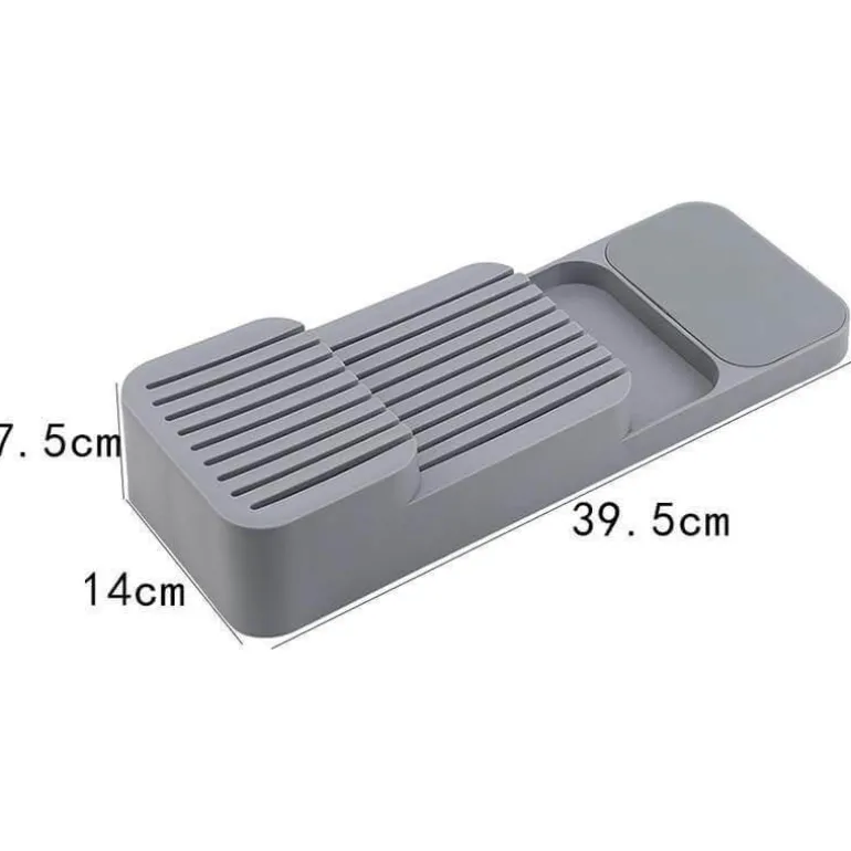 Verwandeln Sie Ihre Küchenorganisation mit diesem innovativen Messerblock-Organizer. Er optimiert den Platz und bietet gleichzeitig effiziente Aufbewahrung für Ihr gesamtes Besteckset. Sein cleveres Design nimmt weniger als die Hälfte des Platzes eines herkömmlichen Besteckkastens ein und ist somit ideal für kleinere Schubladen.