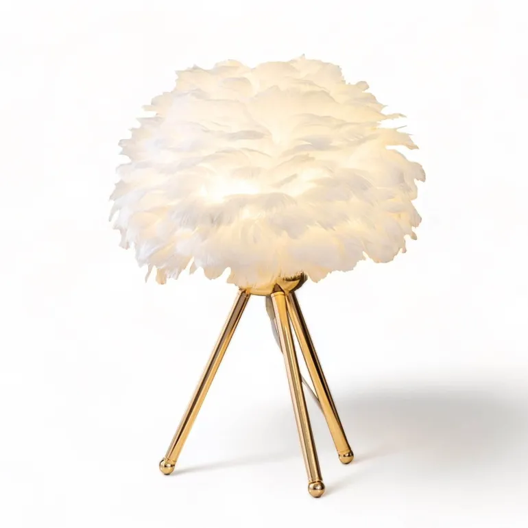 Introducing the Yvonne Table Lamp, a sophisticated lighting fixture designed to elevate the ambiance of any modern space. With its gentle, soft illumination, this lamp highlights the exquisite arrangement of real goose feathers, transforming ordinary lighting into a visually striking experience. The thoughtfully crafted gold base enhances the warm glow emitted when the lamp is lit, contributing to a cozy and inviting environment. Ideal for living rooms, bedrooms, or as a stunning accent piece, the Yvonne Table Lamp seamlessly integrates style and functionality, enriching your decor while providing practical lighting solutions. Explore more at Decor.