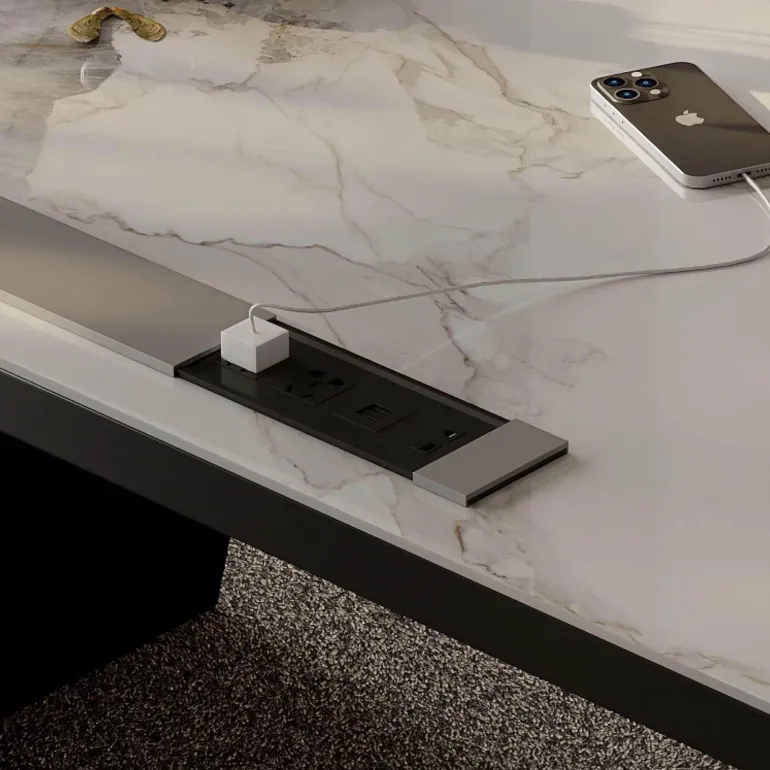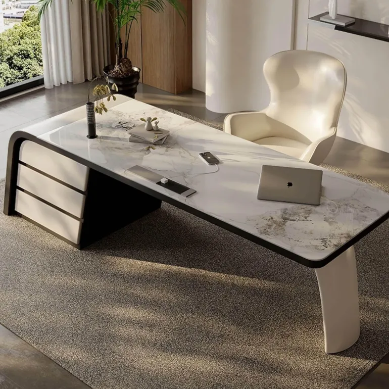 Dieser moderne Arbeitsplatz ist sorgfältig gefertigt und verfügt über eine Arbeitsplatte aus echtem Schiefer, die jeder Umgebung ein Gefühl natürlicher Eleganz verleiht. Der hochglänzende, pulverbeschichtete Rahmen ergänzt die edle Textur des Schiefers und schafft eine elegante und moderne Ästhetik, die Ihrem Zuhause oder Büro einen Hauch von Luxus verleiht.