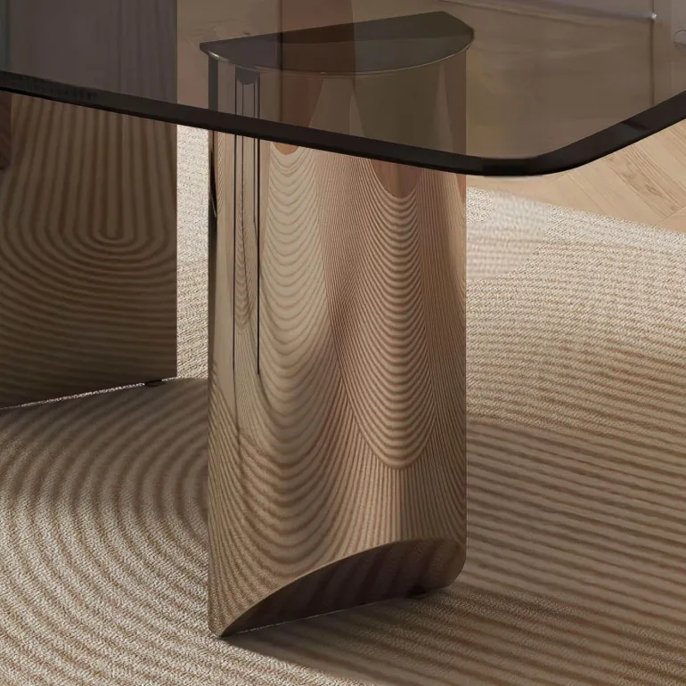 Der moderne Esstisch aus Holz besticht durch eine elegante Tischplatte aus gehärtetem Glas, die das natürliche Licht elegant reflektiert und so den großzügigen Eindruck Ihres Essbereichs unterstreicht. Die transparente Oberfläche schafft eine offene und einladende Atmosphäre und sorgt dafür, dass jede Mahlzeit zu einem Genuss wird.