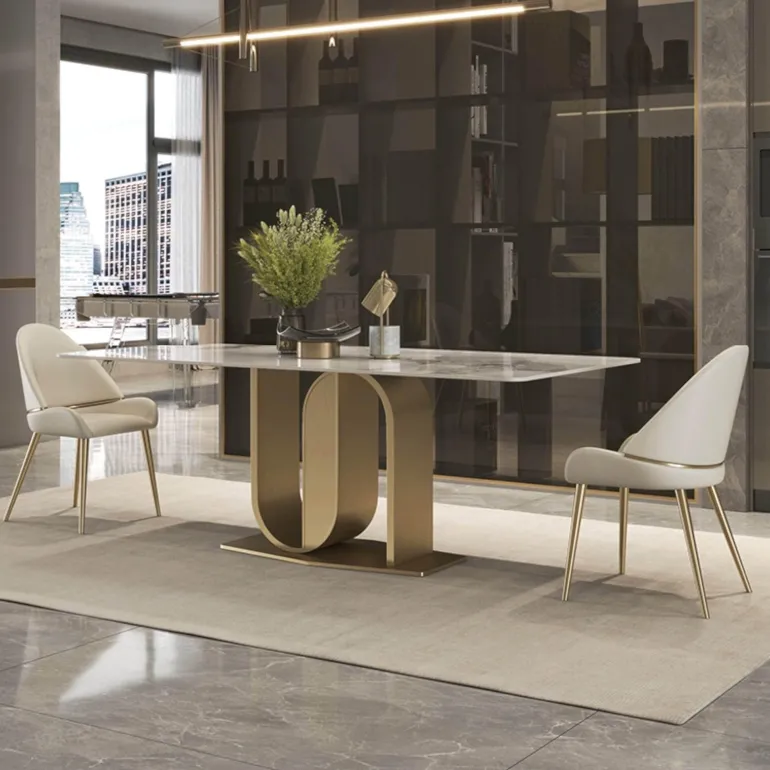 Der Tisch wird von einem stabilen, goldenen Edelstahlrahmen getragen und verkörpert ein raffiniertes Design, das klare Linien mit feinen Details elegant verbindet. Diese Kombination sorgt für optische Akzente und macht ihn zu einem Blickfang in jedem Raum. Die warme, goldene Oberfläche ergänzt die natürliche Schönheit des Schiefers und macht ihn zu einem faszinierenden Mittelpunkt, der aus allen Blickwinkeln die Blicke auf sich zieht.