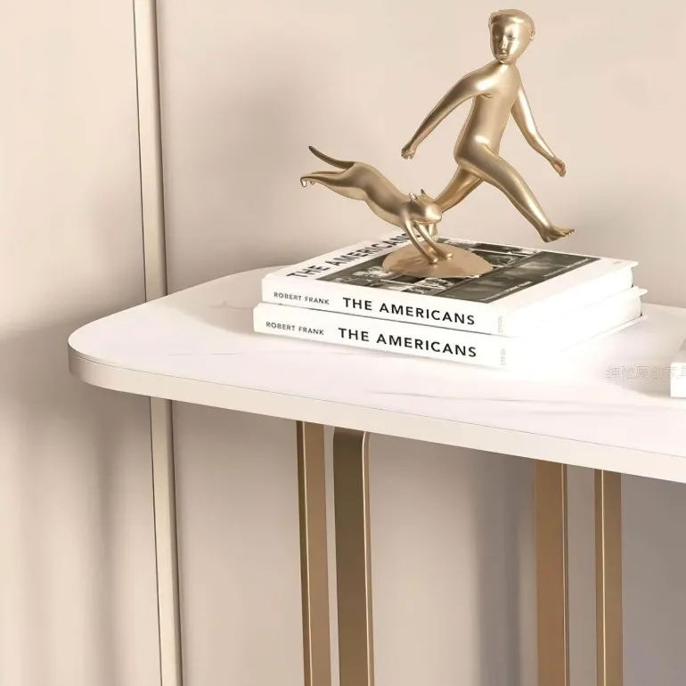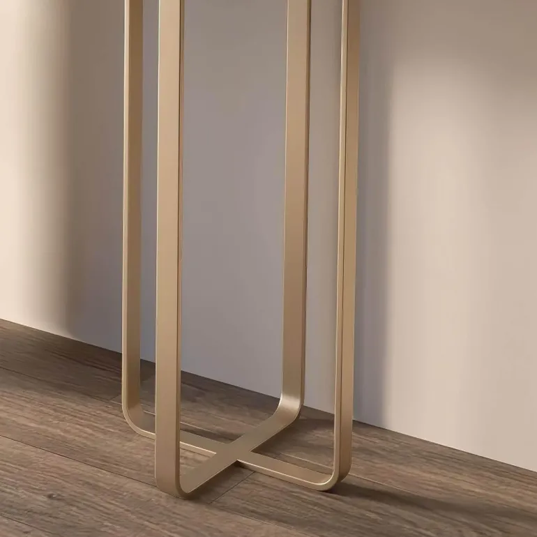 Erleben Sie mit dem Konsolentisch Marius eine harmonische Verbindung aus Luxus und modernem Design. Die eleganten Beine aus goldfarbenem Eisen verleihen diesem stilvollen Möbelstück seinem schlanken Profil einen Hauch von Raffinesse. Die Arbeitsplatte aus importiertem italienischem Schieferstein besticht durch ihre edle, strukturierte Oberfläche, die zeitlose Eleganz und unverwechselbaren Charme ausstrahlt.