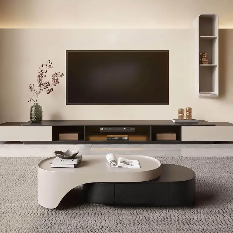 Entdecken Sie den Mueble TV-Schrank, ein modernes Möbelstück, das Flexibilität und Stil perfekt vereint. Dieser vielseitige TV-Schrank ist sorgfältig gefertigt und verfügt über ein Teleskopdesign, mit dem Sie die Länge durch Verschieben der Seitenschränke ganz einfach anpassen und perfekt in Ihren Wohnraum integrieren können.