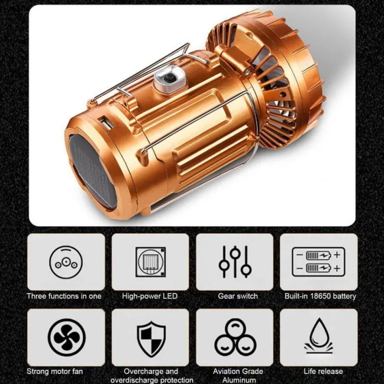 Diese multifunktionale Powerbank-Laterne ist ein vielseitiger Begleiter für draußen. Sie dient als Taschenlampe, Ventilator und tragbares Ladegerät und ist somit ein unverzichtbares Werkzeug für Camping, Wandern, Picknicks und verschiedene Outdoor-Aktivitäten. Kompakt und leicht, passt sie problemlos in Ihre Tasche. Dank ihres wasserdichten Designs müssen Sie sich keine Sorgen um Feuchtigkeit machen und genießen selbst in den dunkelsten Nächten klare Sicht.