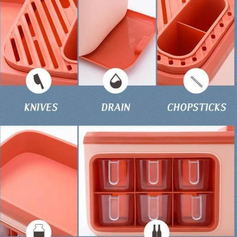 Der Organizer besticht durch sein praktisches Design und verfügt über eine Wasserfilteröffnung am Boden der Trennwand, die dafür sorgt, dass überschüssige Feuchtigkeit abfließen kann. Die herausnehmbare Wasserschale ist von beiden Seiten zugänglich und sorgt so für Komfort und einfache Reinigung.