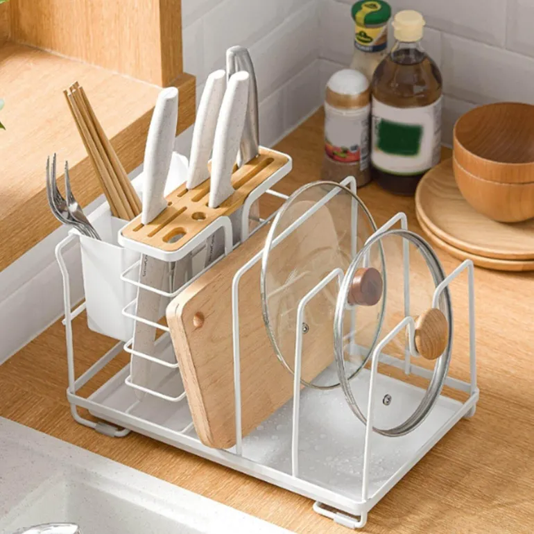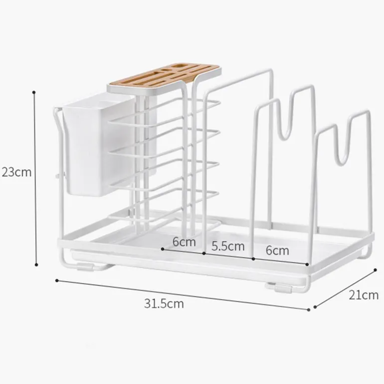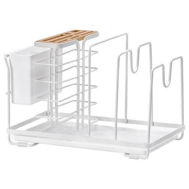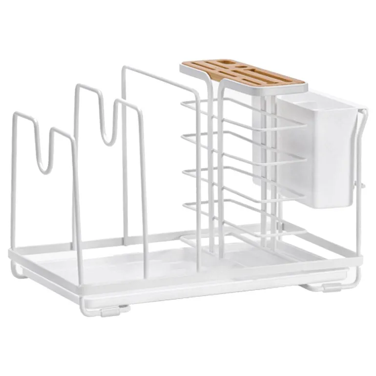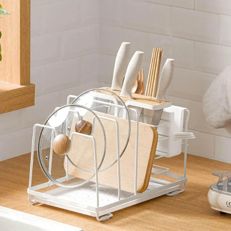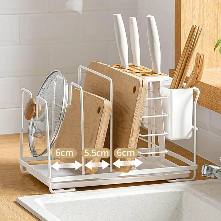 Ausgestattet mit einer Auffangschale am Boden fängt dieser Halter überschüssiges Wasser auf und sorgt dafür, dass Ihre Arbeitsplatte trocken bleibt. Dank des Designs mit mehreren Fächern können verschiedene Küchenutensilien gleichzeitig aufbewahrt werden. Durchdachte Rillen ermöglichen die sichere Aufbewahrung von Topfdeckeln und verhindern ein Verrutschen.