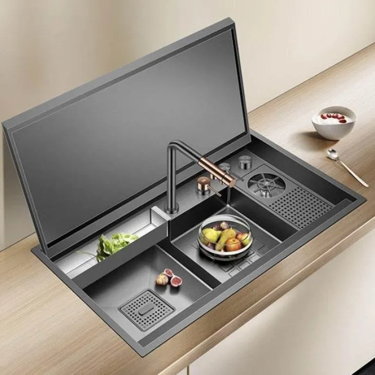 – 1-Tassen-Spüler mit nanometergroßem schwarzen Klappdeckel und versteckter multifunktionaler Spülbeckenfunktion.