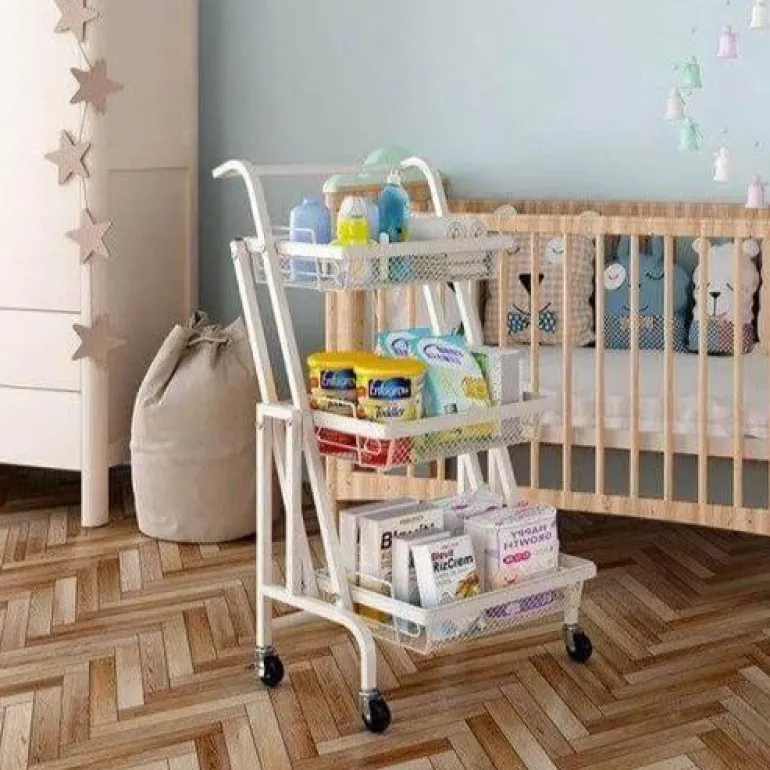 Mit einer durchdachten, geschwungenen unteren Ablage, die sich an Ihre Bedürfnisse anpassen lässt, und einer klappbaren oberen Ablage, die sich leicht unter den Rahmen schieben lässt, ist dieser Organizer auf Komfort optimiert. Die um 360 Grad drehbaren Lenkrollen sorgen dafür, dass er sich nahtlos in jeden Bereich einfügt, ohne zum Hindernis zu werden.