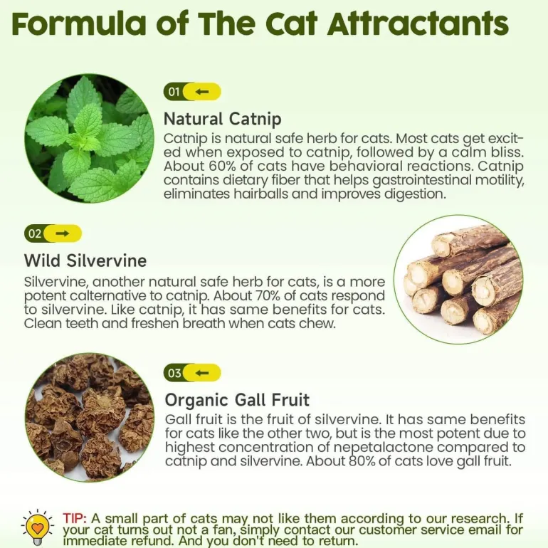 Unsere Minzbällchen fördern nicht nur das Spielvergnügen, sondern unterstützen auch eine gesunde Verdauung. Die Ballaststoffe aus Katzenminze, Silberwein und Gallfrucht fördern die Magen-Darm-Beweglichkeit, tragen zur Reduzierung von Haarballen bei und verbessern die allgemeine Verdauungsgesundheit. Sollte Ihre Katze mit der Zeit das Interesse verlieren, kann ein einfaches Abschneiden der Silberweinstäbe den Duft auffrischen und das Spielerlebnis beleben.
