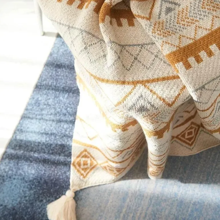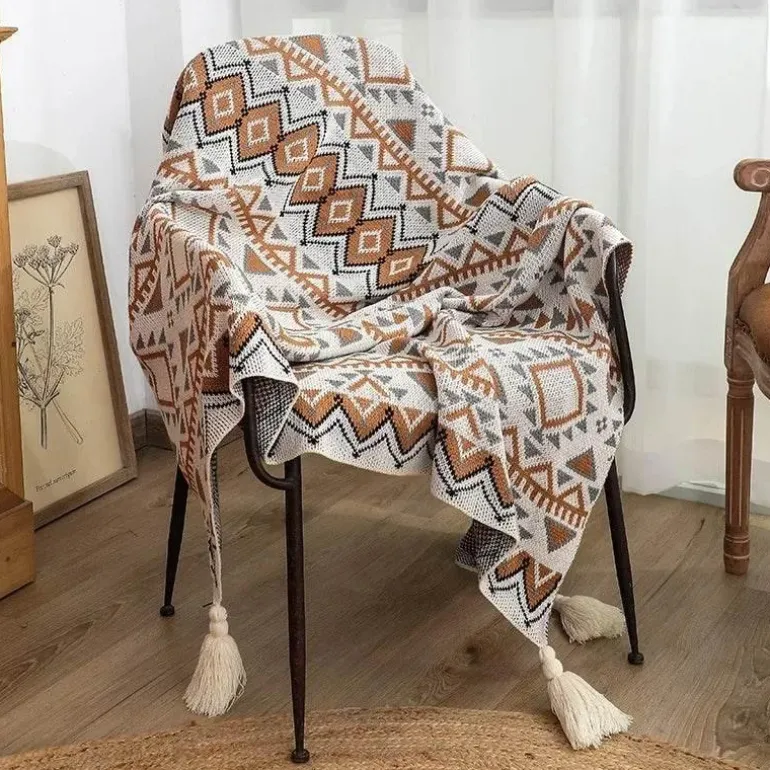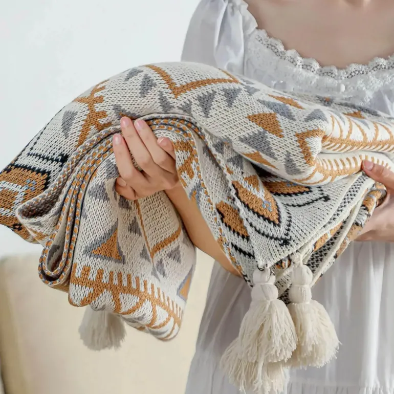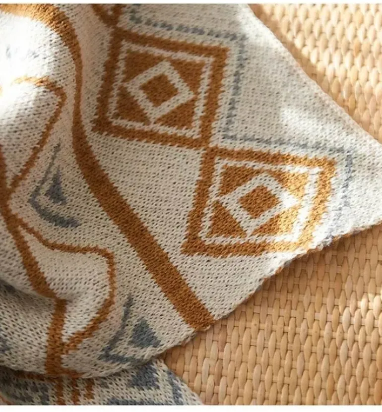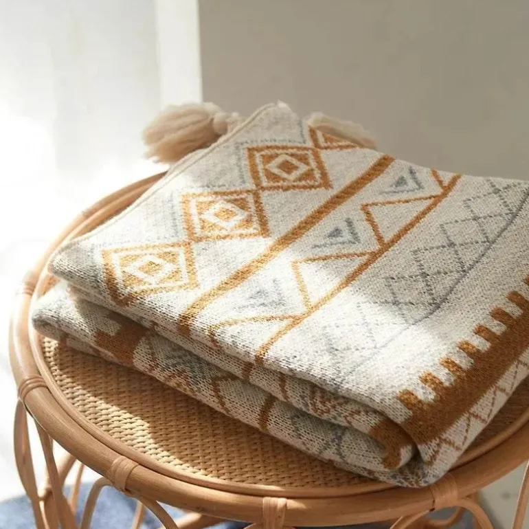 Spüren Sie die einladende Weichheit und Wärme dieser hochwertigen Garndecke. Sie wurde sorgfältig in einer klassischen rechteckigen Form entworfen und ist ideal für Erwachsene. Das elegante geometrische Muster verleiht ihr einen raffinierten Touch und macht sie zu einem vielseitigen Accessoire für jede Jahreszeit, von der Frische des Frühlings bis zur Frische des Herbsts.
