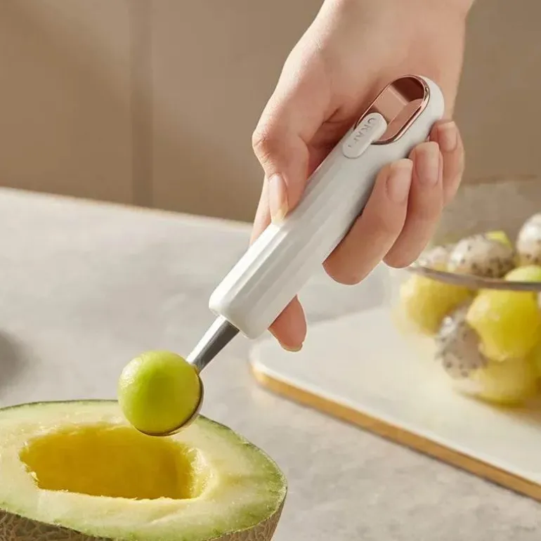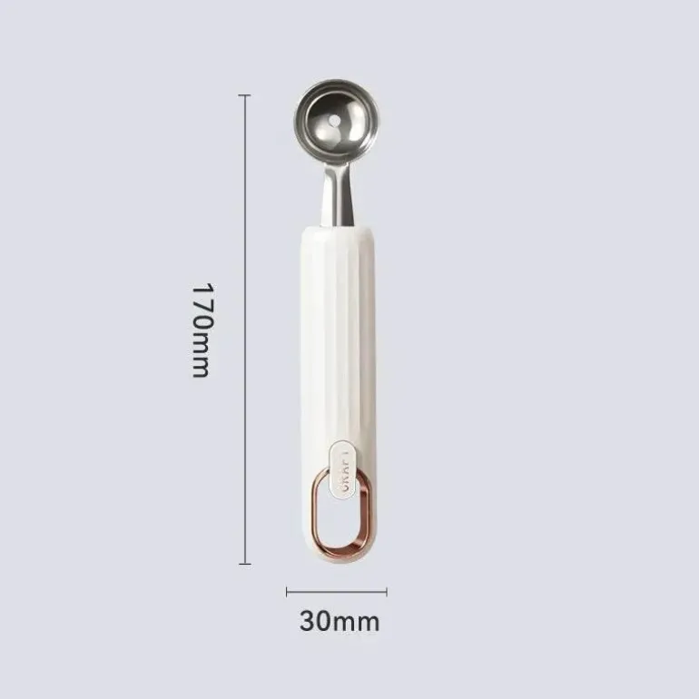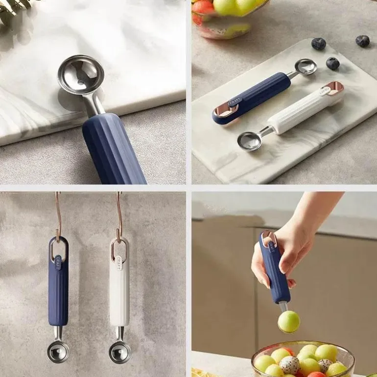 Mit diesem Mehrzweckwerkzeug können Sie mühelos perfekt runde Fruchtkugeln formen oder Eiscreme gleichmäßig portionieren und so Ihren Dessertpräsentationen einen Hauch von Eleganz verleihen. Ob Sie Obstsalate zubereiten, Gerichte garnieren oder Eiskugeln servieren – dieses Werkzeug ist für jeden kulinarischen Liebhaber von unschätzbarem Wert.