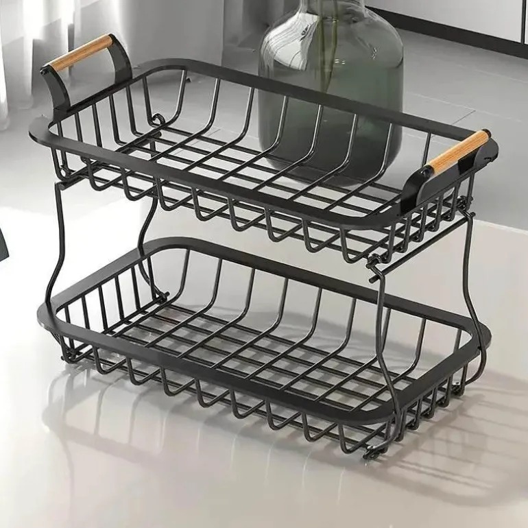 Sorgen Sie mit diesem zweistufigen Obstregal für Ordnung und Stil in Ihrer Küche. Es ist funktional und ästhetisch zugleich. Es besteht aus robustem, mattschwarzem Metall und verfügt über Griffe aus Naturholz, die den Transport Ihrer frischen Produkte mühelos machen. Diese elegante Aufbewahrungslösung präsentiert nicht nur Ihr Obst und Gemüse, sondern verleiht Ihrer Kücheneinrichtung auch einen modernen Touch.