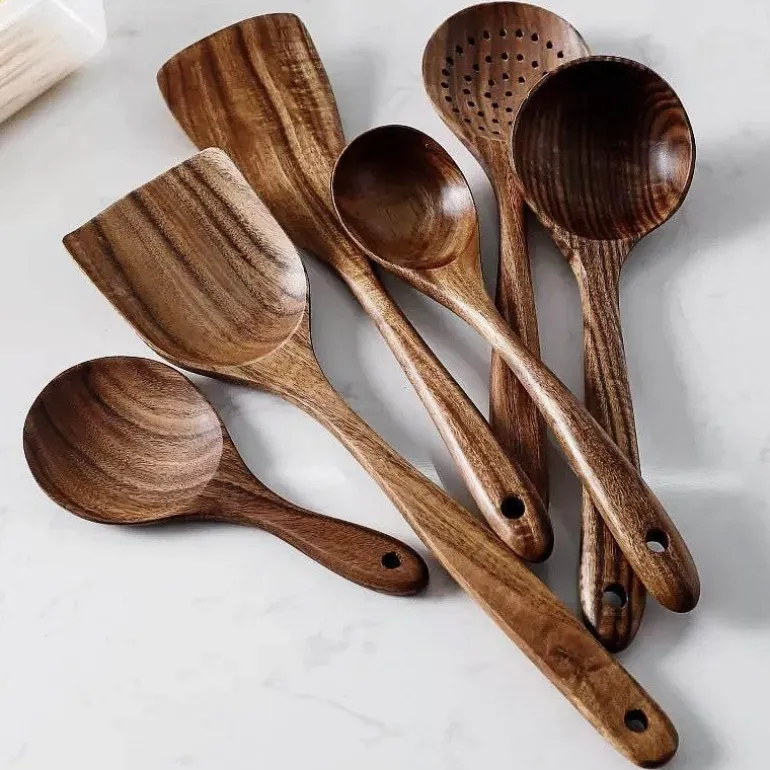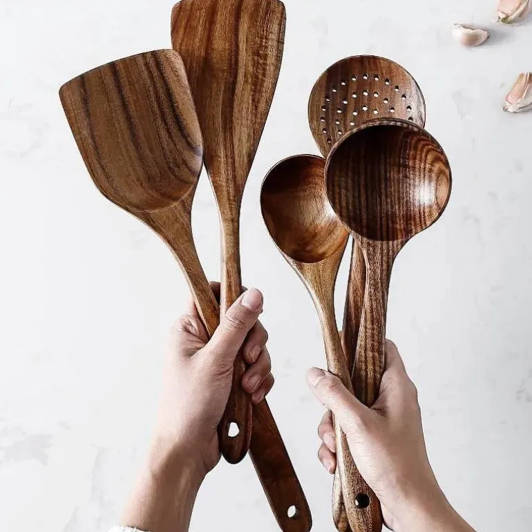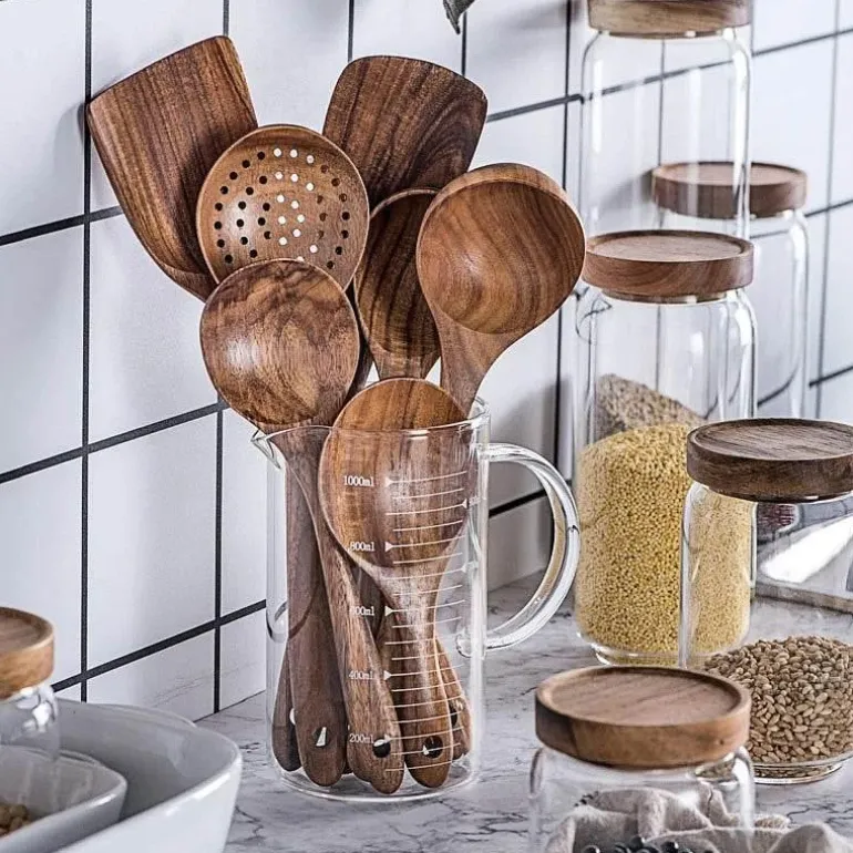 Veredeln Sie Ihr kulinarisches Erlebnis mit den Oksa Küchenutensilien, die Funktionalität und Stil in Ihre Küche bringen. Dieses 7-teilige Set aus hochwertigem Teakholz bietet Langlebigkeit und eine warme, natürliche Ästhetik, die Ihre Arbeitsplatte optisch aufwertet.