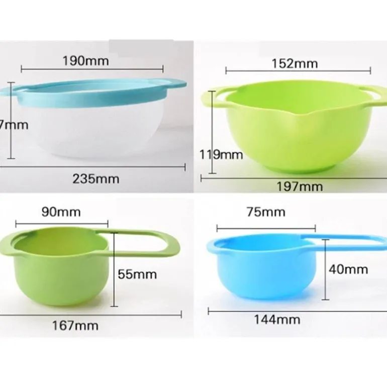Dank des durchdachten Designs und der platzsparenden Stapelfunktion lassen sich diese Schüsseln problemlos ineinander stapeln und eignen sich daher ideal für kleine Küchen mit begrenztem Stauraum. Die Teigschüssel hat breite Ränder und einen praktischen Ausguss, der Spritzer verhindert und so für Ordnung am Arbeitsplatz beim Zubereiten Ihrer Lieblingsgerichte sorgt. Jede Schüssel verfügt über rutschfeste Böden und bequeme Tragegriffe für stabiles Mischen und einfachen Transport der Zutaten.